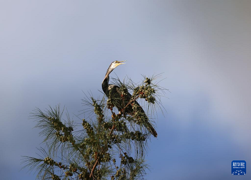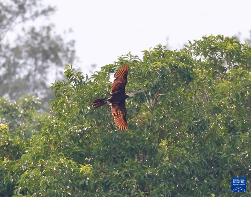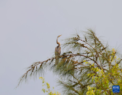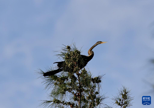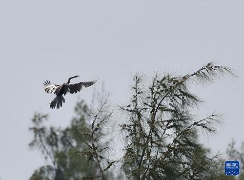 这是7月11日在海南昌江海尾国家湿地公园拍摄的黑腹蛇鹈。(新华社发 薛美丽 摄)