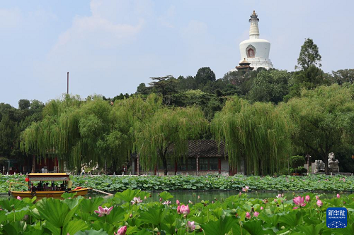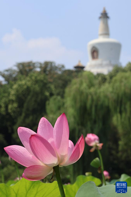 7月22日,北京北海公园盛开的荷花映衬着白塔。(新华社发 戴明轩 摄)