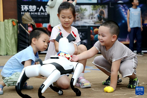 8月3日,山东省东营市的小朋友在AI智能机器人科普展上与智能机器人互动。(新华社发 刘智峰 摄)