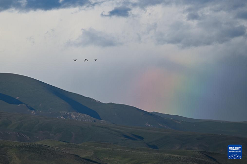 8月3日,一道彩虹出现在那拉提草原的上空。(新华社记者 辛悦卫 摄)