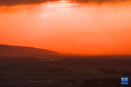 这是8月3日在那拉提草原拍摄的晚霞(无人机照片)。(新华社记者 辛悦卫 摄)