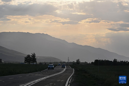8月3日,车辆行驶在那拉提草原的道路上。(新华社记者 辛悦卫 摄)