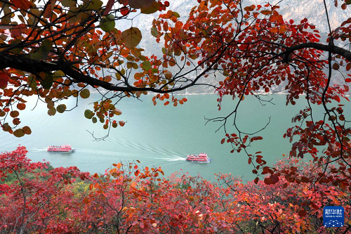 12月7日,船只行驶在红叶映衬下的长江三峡巫峡段。(新华社发 王忠虎 摄)