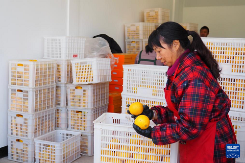 12月11日,在浙江省庆元县竹口镇黄坛水干果园区,一名工人在分拣甜桔柚。(新华社记者 刘梓漪 摄)