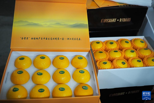 这是12月11日在浙江省庆元县竹口镇黄坛水干果园区内拍摄的分装好的甜桔柚礼盒。(新华社记者 刘梓漪 摄)