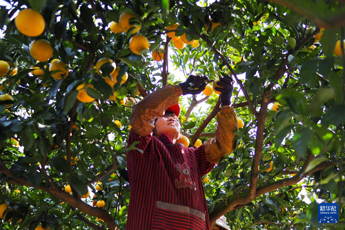 12月11日,在浙江省庆元县竹口镇黄坛水干果园区内,工人在采摘甜桔柚。(新华社记者 刘梓漪 摄)