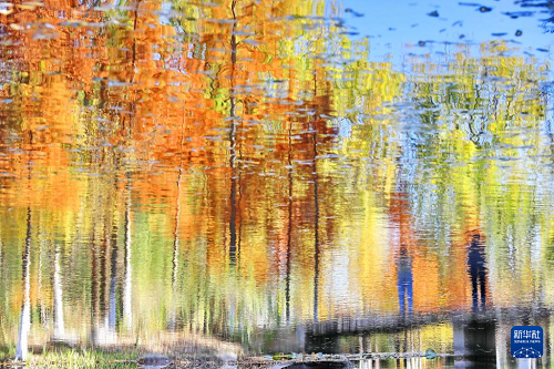 12月9日,在浙江省嘉兴市西南湖生态公园,游客与水杉的倒影相映成景(照片翻转180度)。(新华社发 金鹏 摄)
