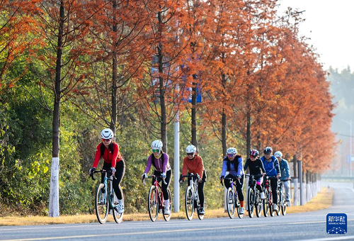12月7日,自行车运动爱好者在安徽省芜湖市繁昌区繁阳镇范马村骑行。(新华社发 肖本祥 摄)
