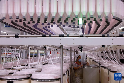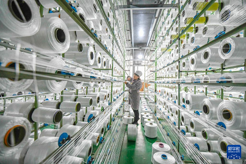 12月16日, 工人在山东枣庄经济开发区一家企业的智能化生产线上加工高端纱线。(新华社发 孙中喆 摄)