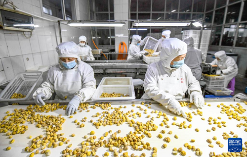 12月16日,工人在河北省遵化市苏家洼镇的一家食品有限公司车间加工板栗。(新华社发 刘满仓 摄)