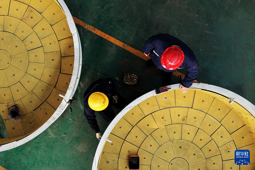 12月16日,在山东青岛中青林集团有限公司生产车间,工人在安装搅拌机衬板(无人机照片)。(新华社发 王海滨 摄)