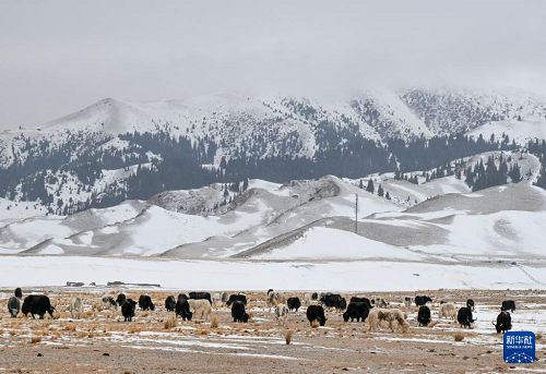 牛群在赛里木湖边吃草(12月15日摄)。(新华社记者 王菲 摄)
