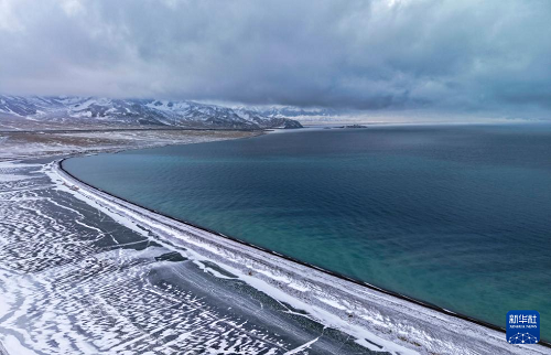 12月16日拍摄的赛里木湖和雪山(无人机照片)。(新华社发 徐锐 摄)
