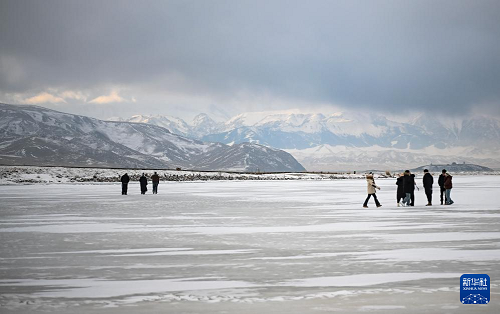 游客在赛里木湖的冰面上游玩(12月16日摄)。(新华社发 徐锐 摄)