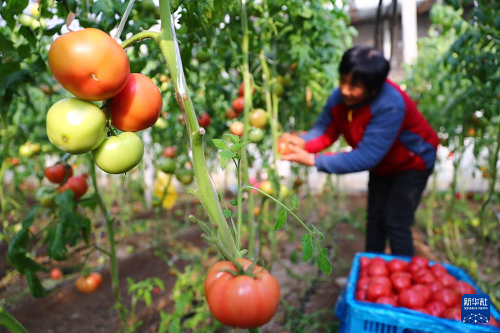 12月18日,菜农在山东省滕州市西岗镇采摘西红柿。(新华社发 李志军 摄)