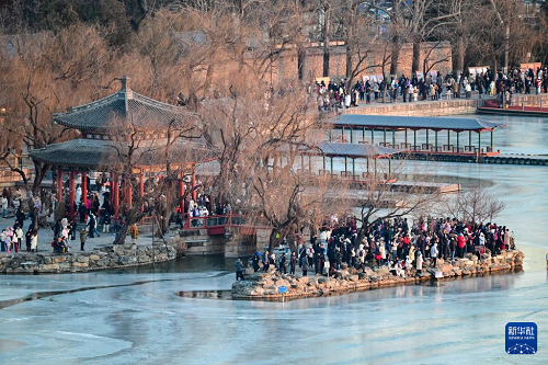 12月21日是冬至节气,北京颐和园十七孔桥的“金光穿洞”景观吸引了众多游客与摄影爱好者观赏拍摄。