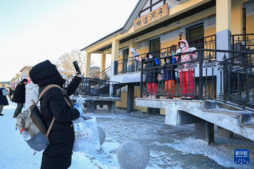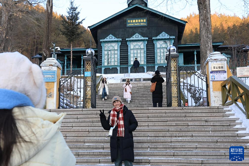 12月24日,游客在横道河子镇中东铁路博物馆前拍照。(新华社发 徐率 摄)