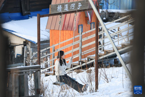 12月24日,游客在横道河子镇体验雪地秋千。(新华社发 徐率 摄)