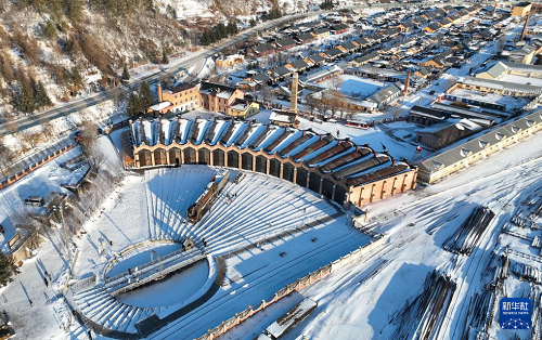 12月24日,游客参观横道河子镇中东铁路博物馆机车库展区(无人机照片)。(新华社发 徐率 摄)