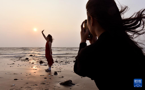 1月2日,游客在广东湛江市徐闻县角尾乡灯楼角观看日出并留影。(新华社发 訚洪 摄)