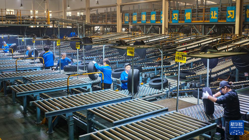 1月4日,在山东省东营市广饶县大王镇的一家橡胶轮胎企业,工人们对橡胶轮胎进行外观检查(无人机照片)。(新华社发 刘云杰 摄)