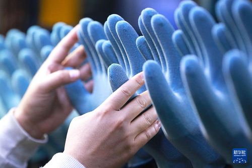 1月4日,在山东省高密市,一家企业的员工在车间生产防护手套。(新华社发 李海涛 摄)