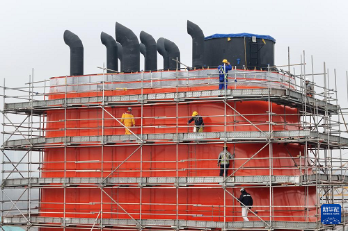 1月4日,在山东烟台黄渤海新区一家造船企业,工作人员对一座大型船舶的船体模块进行质量检查(无人机照片)。(新华社发 唐克 摄)