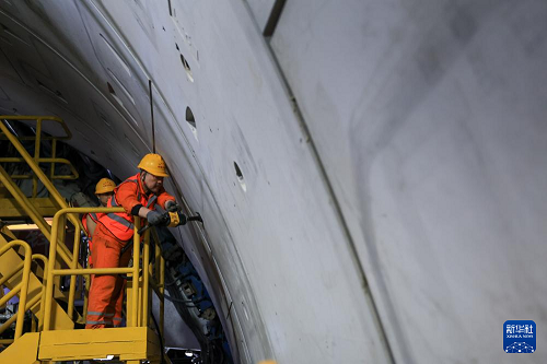 1月6日,中铁十四局施工人员在“深江1号”盾构机上进行管片螺栓紧固工作。(新华社记者 毛思倩 摄)