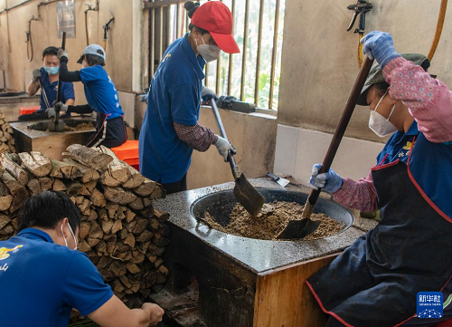 1月11日,海南省琼海市嘉积镇温泉村一家作坊工作人员在翻炒山柚籽粉。(新华社发 蒙钟德 摄)