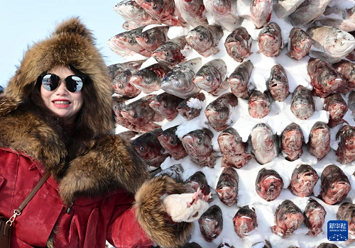 1月10日,在黑龙江省肇东市大似海冬捕渔猎文化节上, 游客在“冻鱼塔”前留影。(新华社发 杨威 摄)