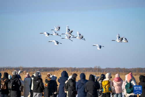 1月21日,游客在黑龙江扎龙国家级自然保护区内观看丹顶鹤。(新华社记者 张涛 摄)