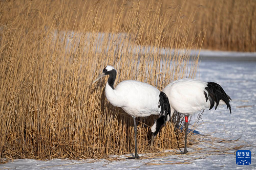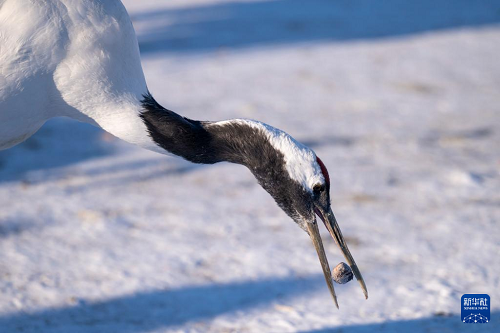 冬日时节,黑龙江扎龙国家级自然保护区内白雪皑皑,丹顶鹤在寒风中觅食,上演一幅鹤舞冬日的纯净画面。