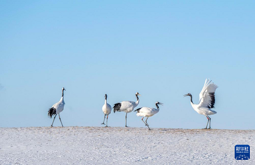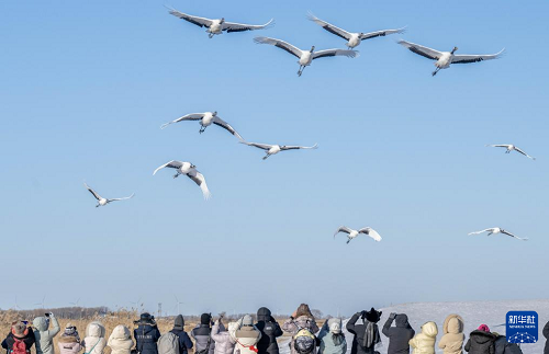 时值深冬,位于黑龙江省齐齐哈尔市的黑龙江扎龙国家级自然保护区银装素裹,冰雪中起舞飞翔的丹顶鹤吸引游客前来参观、拍照。