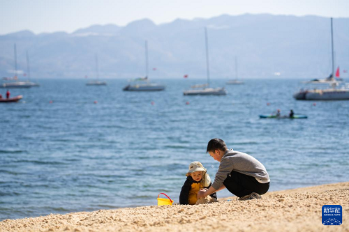1月27日,小朋友在云南省玉溪市抚仙湖畔玩耍。(新华社记者 高咏薇 摄)