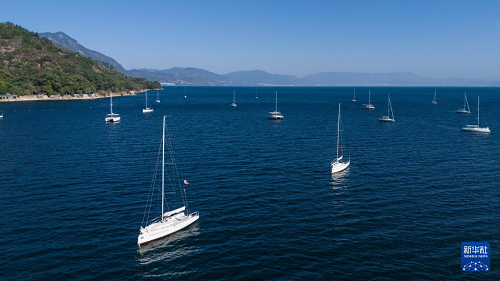 1月27日,游客在云南省玉溪市抚仙湖划船游玩(无人机照片)。(新华社记者 高咏薇 摄)