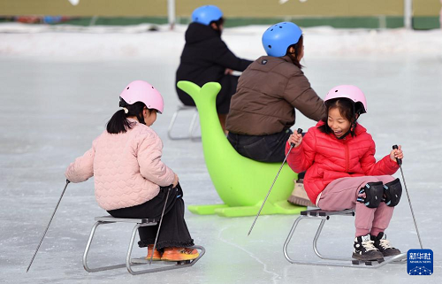 1月28日,在北京市平谷区镇罗营镇湖畔耕读园,游客在活动现场滑冰车。(新华社记者 任超 摄)