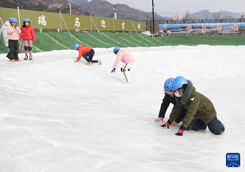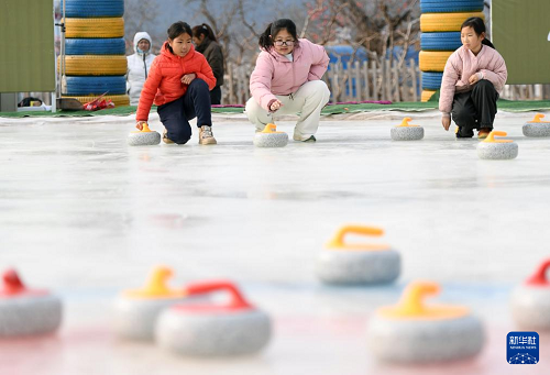 1月28日,在北京市平谷区镇罗营镇湖畔耕读园,小朋友们在活动现场体验冰壶。(新华社记者 任超 摄)