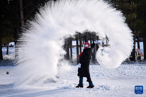 1月29日,在漠河北极村景区内的北极沙洲,游客体验“泼水成冰”。(新华社记者 王祚 摄)