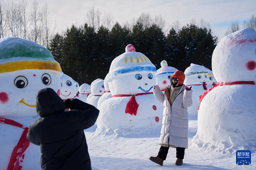 1月29日,游客在漠河北极村景区内的北极沙洲与雪人“矩阵”合影。(新华社记者 王祚 摄)