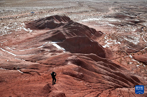 1月29日,游客在内蒙古乌兰察布市四子王旗红崖台地拍照游玩。(新华社记者 贝赫 摄)