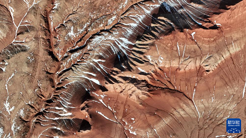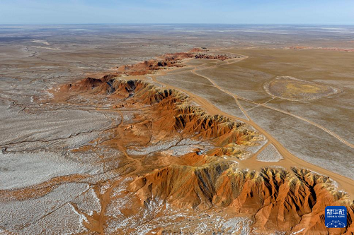 红崖台地位于内蒙古乌兰察布市四子王旗北部,是内蒙古四子王国家地质公园的重要组成部分。这里山丘耸立、沟壑纵横,山体呈现赤红色。隆冬时节,稀薄残雪点缀其间,在苍茫天地中勾勒出一幅静谧而壮丽的自然画卷。