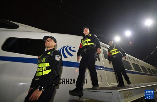 2月2日凌晨,南宁铁路公安局南宁公安处长岗岭站派出所民警在南宁动车所巡逻,认真检查各种设施安全情况,守护即将开启的2026年春运。