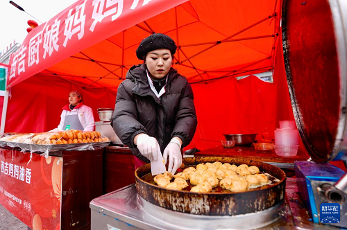 2月3日,商户在宁夏固原市西吉县年货大集上制作小吃。(新华社记者 杨植森 摄)