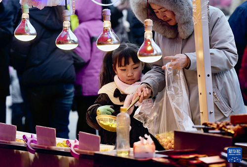 2月3日,游客在宁夏固原市西吉县年货大集上选购美食。(新华社记者 杨植森 摄)