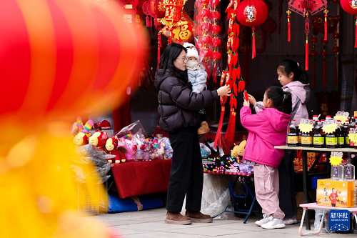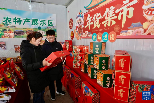 2月3日,游客在宁夏固原市西吉县年货大集上选购年货产品。(新华社记者 杨植森 摄)