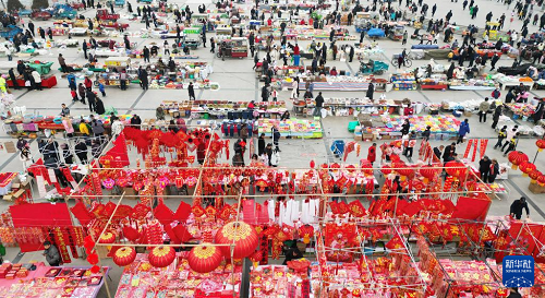 2月4日,在甘肃省临夏回族自治州永靖县刘家峡镇年货市场,人们选购年货(无人机照片)。(新华社发 史有东 摄)
