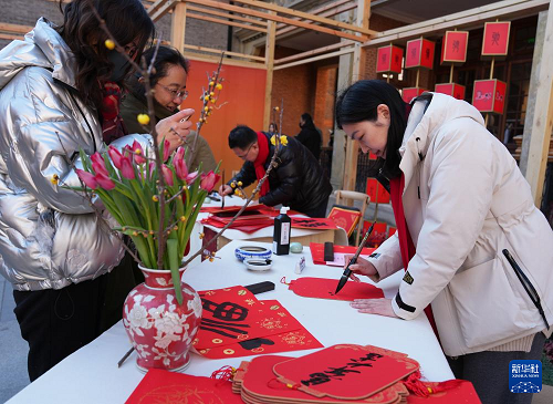 2月8日,书法家们在游园会上为市民写春联和福字。(新华社记者 刘颖 摄)
