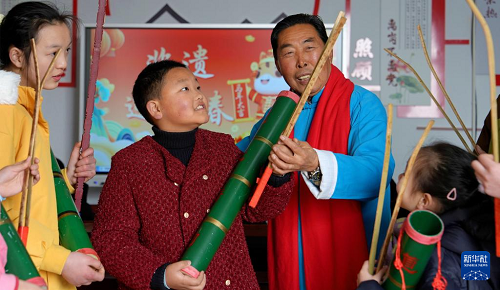 2月13日,文化志愿者在江苏省海安市墩头镇墩西村教寒假公益托管班的学生学唱省级非遗“水乡道情”。(新华社发 周强 摄)