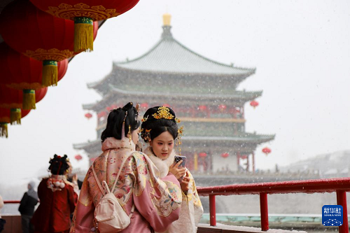 2月23日,游客在陕西省西安市钟楼旁赏雪拍照。(新华社发 薛刚 摄)