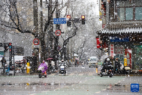 2月23日,在陕西省西安市街头,市民冒雪出行。(新华社发 薛刚 摄)
